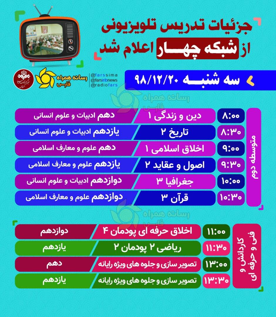 جدول زمانی پخش زنده دروس روزسه شنبه ۲۰ اسفند ۹۸ مدارس کشور اعلام شد.