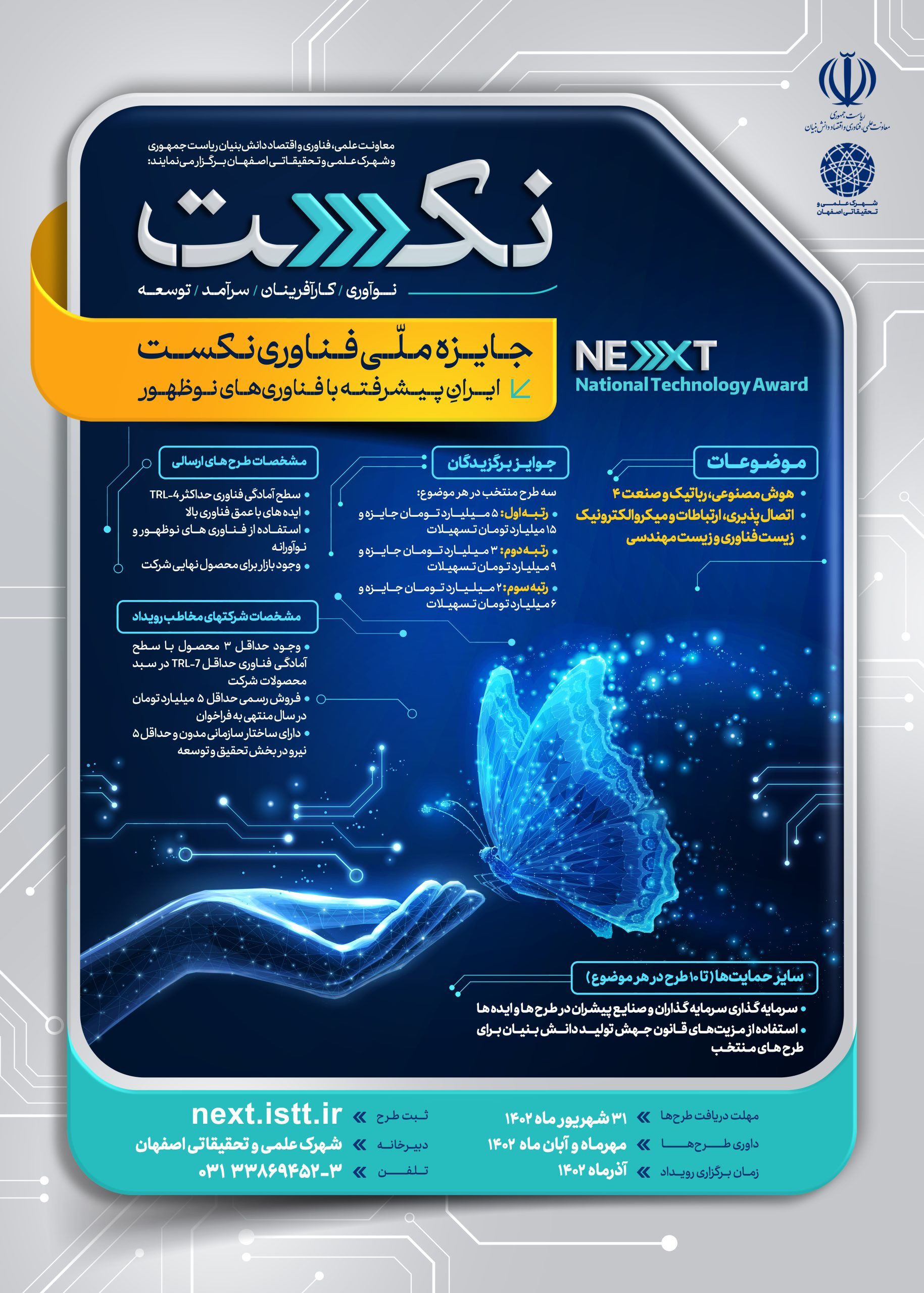 مهلت ارسال طرحها و ایدههای فناورانه تا ۳۱ شهریور ۱۴۰۲ است، داوری طرحها تا پایان آبان انجام میشود و رویداد جایزه فناوری نکست در آذرماه امسال در شهر اصفهان برگزار و طرحهای برتر معرفی خواهند شد.