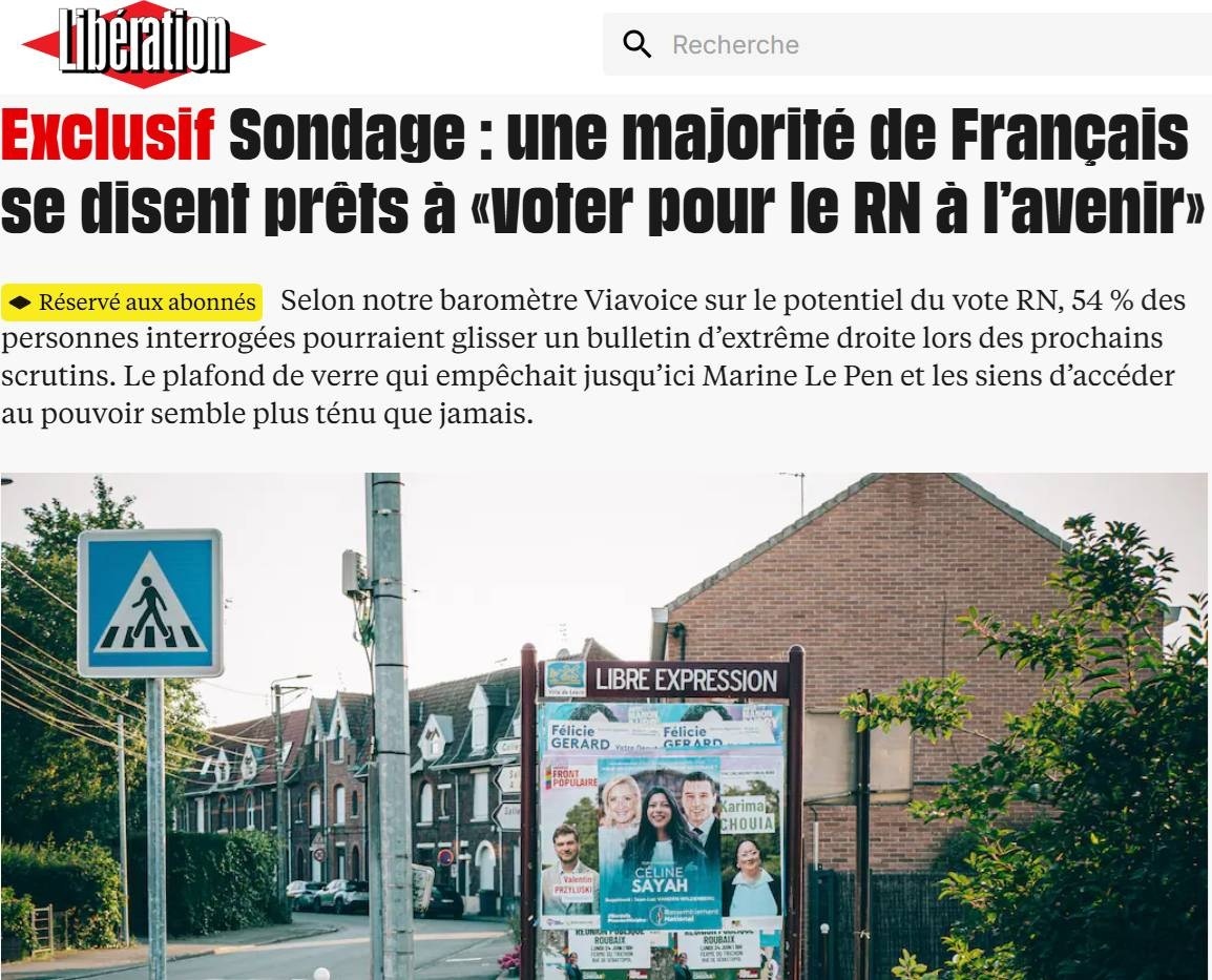 لیبراسیون – نظرسنجی انحصاری: بیشتر فرانسویها (۵۴ درصد) گفتهاند در انتخابات ریاست جمهوری آینده به مارین لوپن و حزب او (تجمع ملی) رای میدهند.